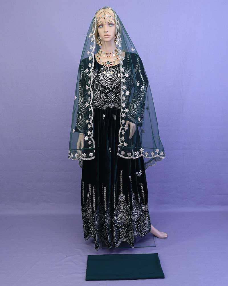 Klänningstyg: Kraftig viskos sammet med kraftiga 5 mm broderi sekvenser, hel ärmar